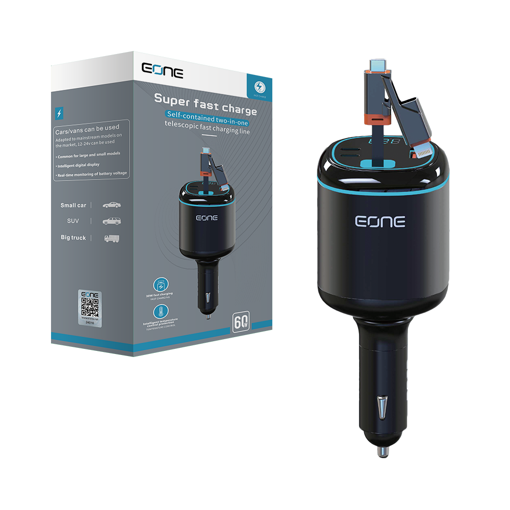 يتم توصيل الشاحن بمخرج السيارة (12V/24V)، واستخدام الكابل المدمج لتوصيل الجهاز المراد شحنه، سواء كان هاتفًا ذكيًا، جهاز لوحي، أو أجهزة إلكترونية أخرى تدعم الشحن السريع.